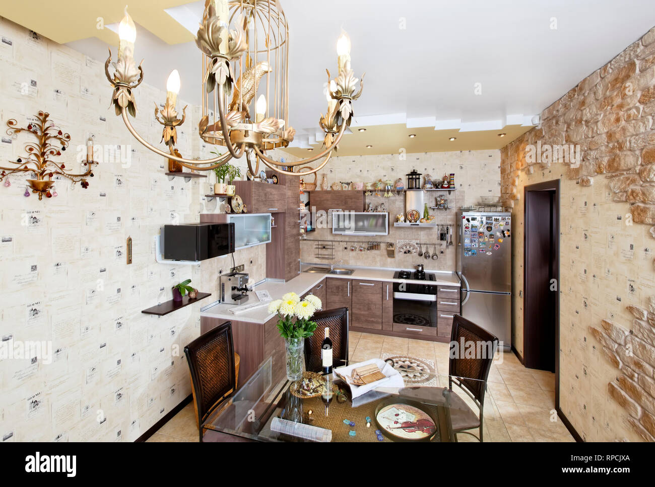 Holz Moderne Kuche Mit Esstisch Und Steindekore Stockfoto